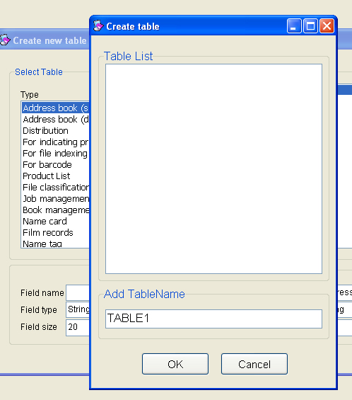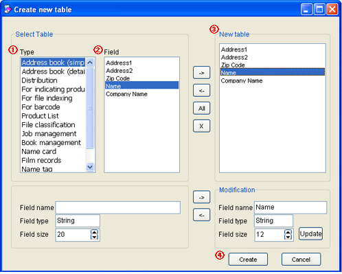 Select required table from types of table on ① and move required fields among field items of ② using -> to new table item of ③ and click ④ Create.