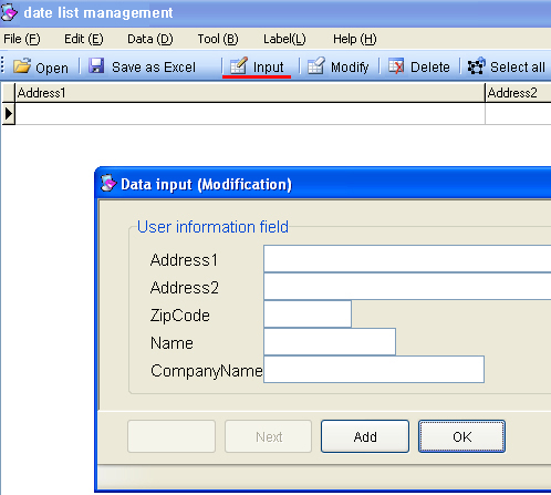6. Click Enter from data list management and enter data. However) Select corresponding zip code by clicking Search button after entering only Dong (village) at Address 1 for searching zip code.