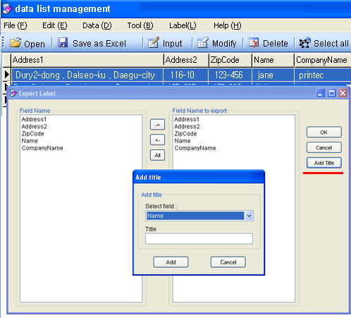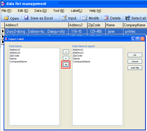 5. Click "Export" after selecting the names of fields to print on label and sending them to the right.